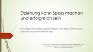 Ermutigende Erziehungsstrategien und Tipps führen zum demokratischen Miteinander. Was können wir in welchem Alter von unseren Kindern erwarten? Anhand von vielen praktischen Beispielen lernen wir, wie wir unserem Kind Verantwortung übergeben und ein angenehmeres Miteinander erlernen und erleben können. Wir lernen, unsere Kinder durch Ermutigung zu motivieren, ihre Stärken zu fördern und ihre Bemühungen anzuerkennen.